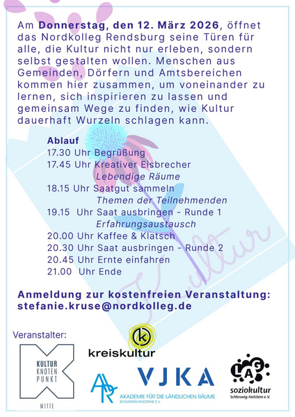 Am Donnerstag, den 12. März 2026 öffnet das Nordkolleg seine Türen für alle, die Kultur nicht nur erleben, sondern selbst gestalten wollen. Menschen aus Gemeinden, Dörfern und Amtsbereichen kommen zusammen, um voneinander zu lernen, sich inspirieren zu lassen und gemeinsam Wege zu finden, wie Kultur dauerhaft Wurzeln schlagen kann.